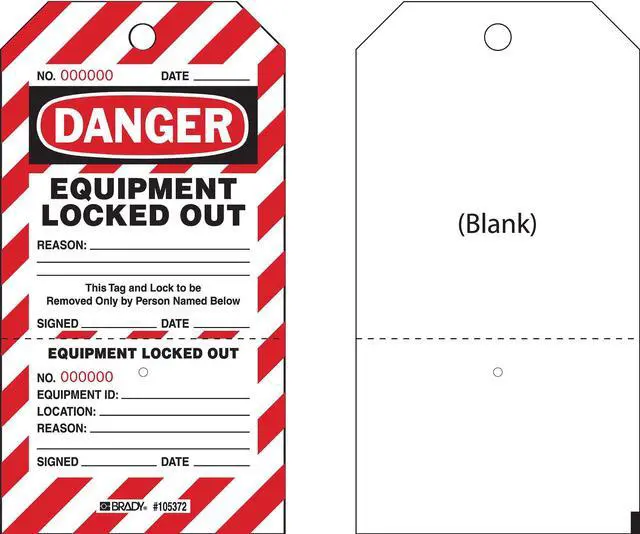 Danger Tag, Material Cardstock, Legend Equipment Locked Out, Height 7 1/2 in, Width 4 in, Hole Size 3/8 in, Header Danger, Legend Color Black, Background Color Red, White, Legend Style Text, Write on Surface Yes, Package Quantity 25. This item has been restricted from sale in the following state (s): []