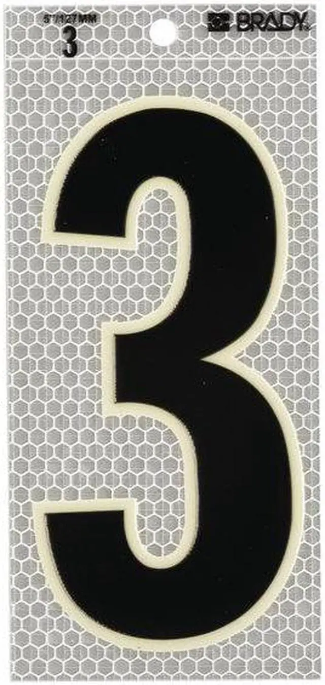 Number Label, Character 3, Character Height 5 In., Overall Height 6 In., Overall Width 3 In., Character Type Numbers, Material Vinyl, Background Color Silver, Retroreflective Grade High Intensity Prismatic, Glow-in-the-Dark Yes, Markers per Card 1, Number of Cards 10, Standards ASTM D 523; ASTM D 4956, Character Color Black/Green, Package Type Sheet, Die Cut Yes, Package Quantity 10. This item has been restricted from sale in the following state (s): []
