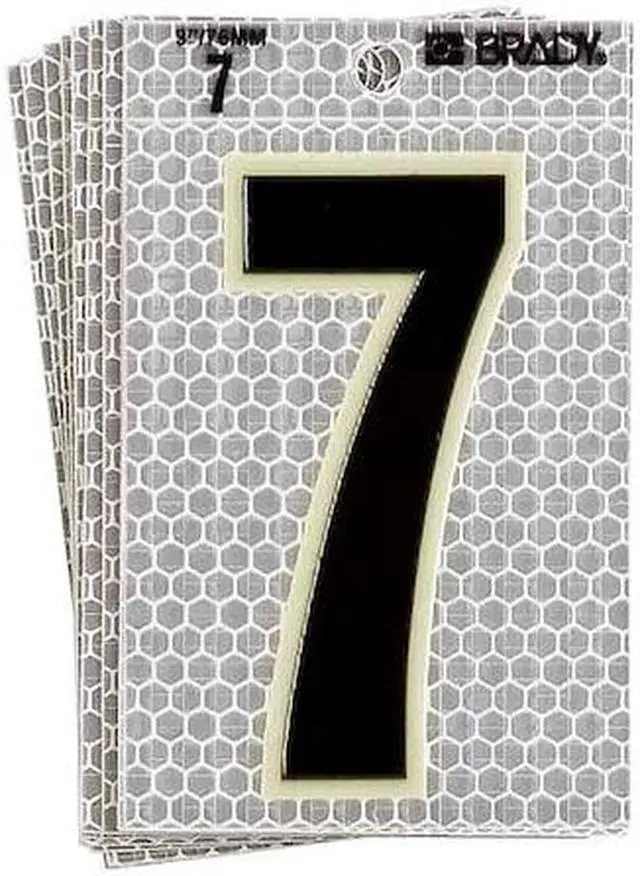 Number Label, Character 7, Character Height 5 in, Overall Height 6 in, Overall Width 3 in, Character Type Numbers, Material Vinyl, Background Color Silver, Retroreflective Grade High Intensity Prismatic, Glow-in-the-Dark Yes, Markers per Card 1, Number of Cards 10, Standards ASTM D 523; ASTM D 4956, Character Color Black/Green, Package Type Sheet, Die Cut Yes, Package Quantity 10. This item has been restricted from sale in the following state (s): []