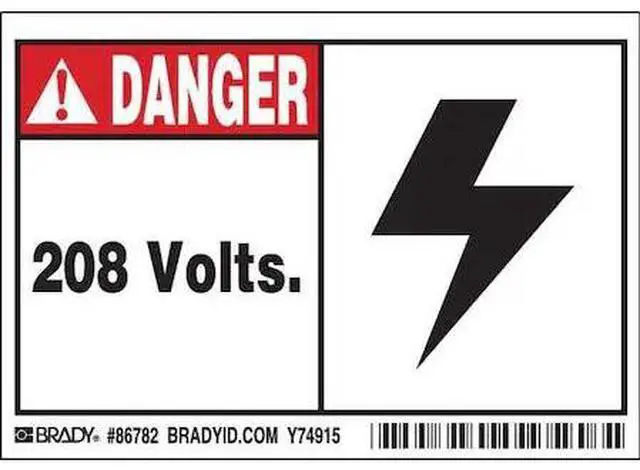 Machine/Equipment Label, Horizontal Rectangle, Number of Printed Sides 1, English, Sign Legend 208 Volts, Sign Legend Style Symbol and Text, Package Quantity 5. This item has been restricted from sale in the following state (s): []