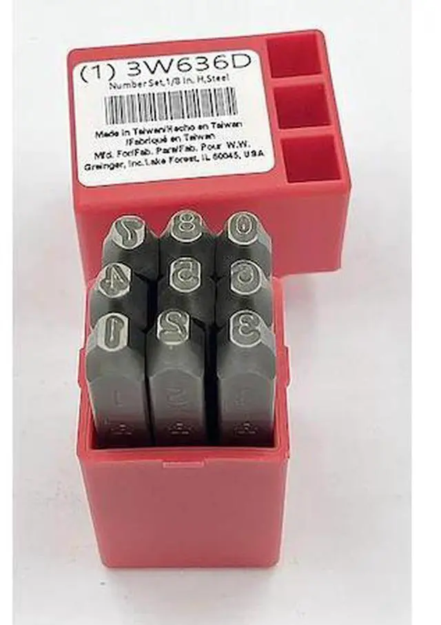 Number Set, Character Height 1/8 In., Shank Length 2-1/2 In., Shank Size Square 5/16 In., Material Steel, Hardness 58 to 62HRC at the Engraving End and 38 to 46HRC at the Striking End, Case Material Plastic, Includes (9) Pieces - 0 thru 8 with 6 Serving as 9, Standards Federal Specification GGG-D-280C. This item has been restricted from sale in the following state (s): []