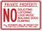 Property Sign, Horizontal Rectangle, Number of Printed Sides 1, English, Sign Format Other Format, Sign Legend Private Property No Soliciting Loitering Loud Music Walking Dogs Dumping All Offenders Will Be Prosecuted To The Full Extent Of The Law, Sign Legend Background Color White, Sign Legend Style Text. This item has been restricted from sale in the following state (s): []