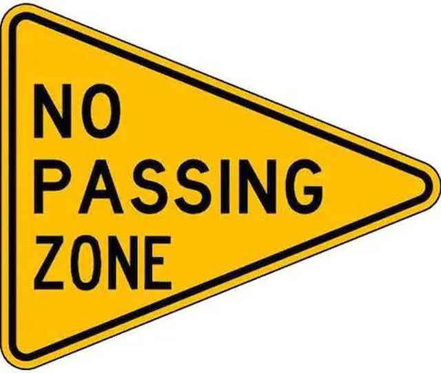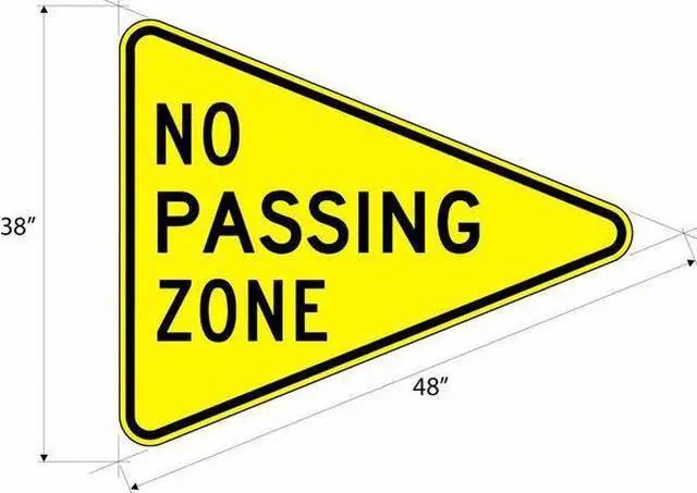 No Passing Zone Traffic Sign, Height 38 in, Width 48 in, Sign Material Aluminum, Sign Mounting Style Mounting Holes, Printed Language English, Sign Shape Triangle. This item has been restricted from sale in the following state (s): []