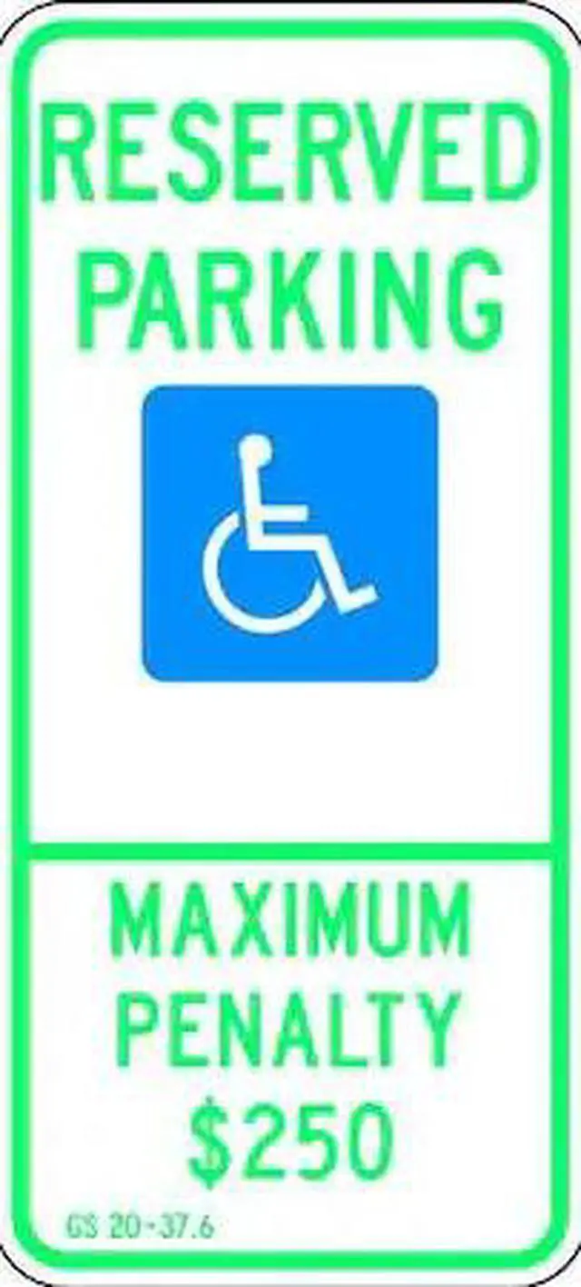 ADA Handicapped Parking Sign, Height 26 in, Width 12 in, Sign Material Aluminum, Sign Mounting Style Mounting Holes, Printed Language English, Sign Shape Vertical Rectangle. This item has been restricted from sale in the following state (s): []