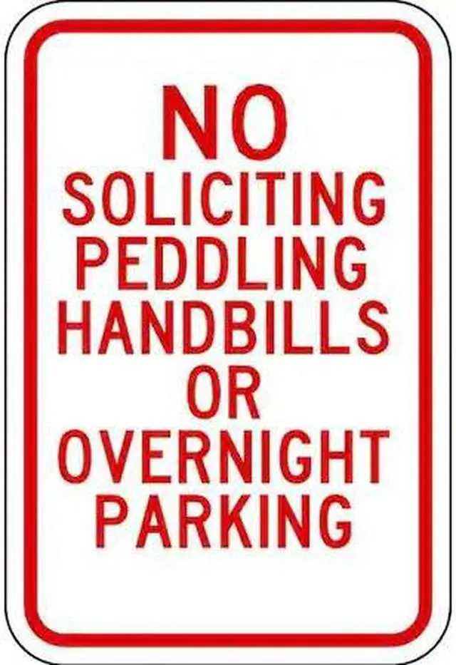Parking Sign, Vertical Rectangle, Number of Printed Sides 1, English, Sign Legend No Soliciting Peddling Handbills Or Overnight Parking, Sign Legend Background Color White, Sign Legend Style Text. This item has been restricted from sale in the following state (s): []