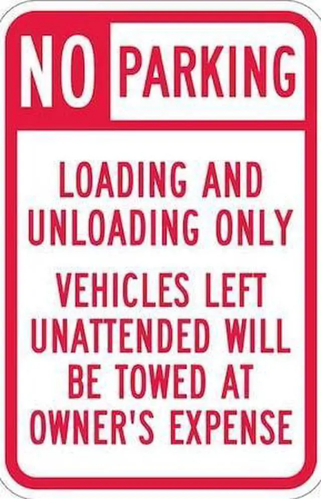 Loading & Unloading Zone No Parking Sign, Height 18 in, Width 12 in, Sign Material Aluminum, Sign Mounting Style Mounting Holes, Printed Language English, Sign Shape Vertical Rectangle. This item has been restricted from sale in the following state (s): []