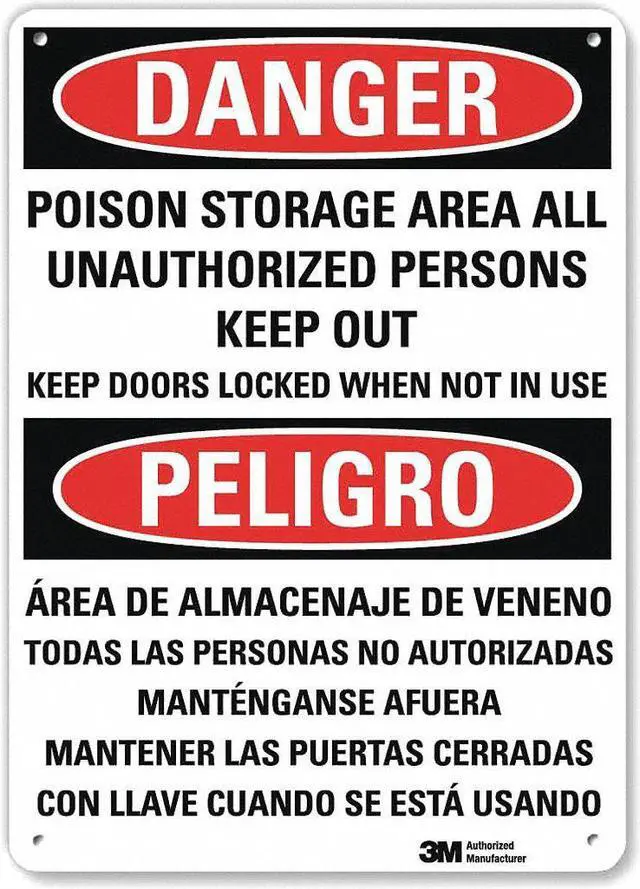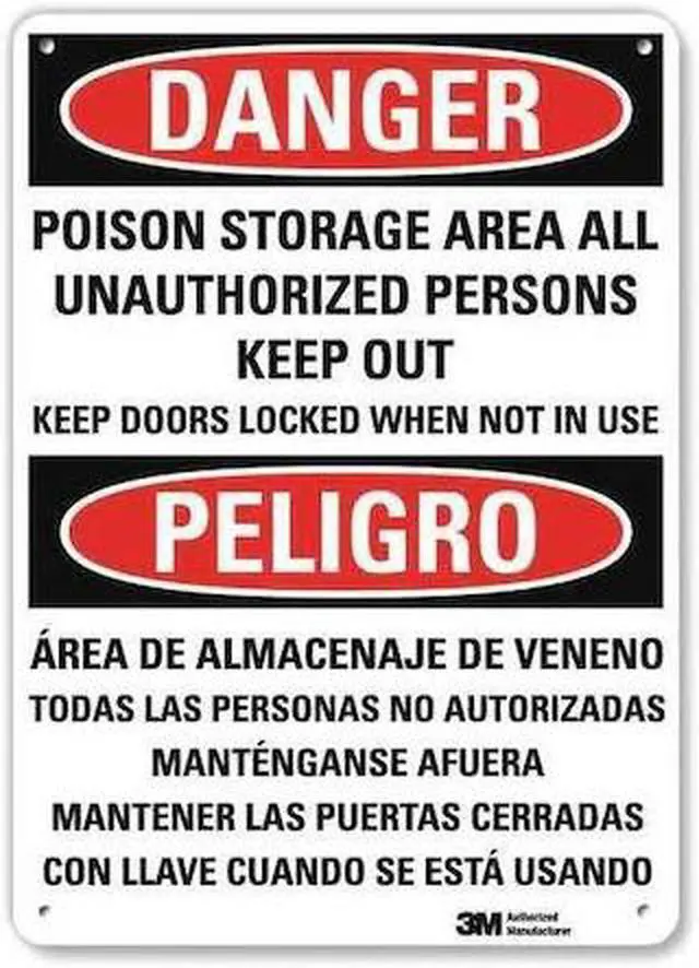 Danger Sign, Vertical Rectangle, Number of Printed Sides 1, English, Sign Format Traditional OSHA, Sign Legend Poison Storage Area All Unauthorized Persons Keep Out Keep Doors Locked When Not In Use/Area De Almacenaje De Veneno To Das Las Personas No Autorizadas Mantengase Afuera Mantener Las Puertas Cerradas Con Llave Cuando Se Esta Usando, Sign Legend Background Color White, Sign Legend Style Text