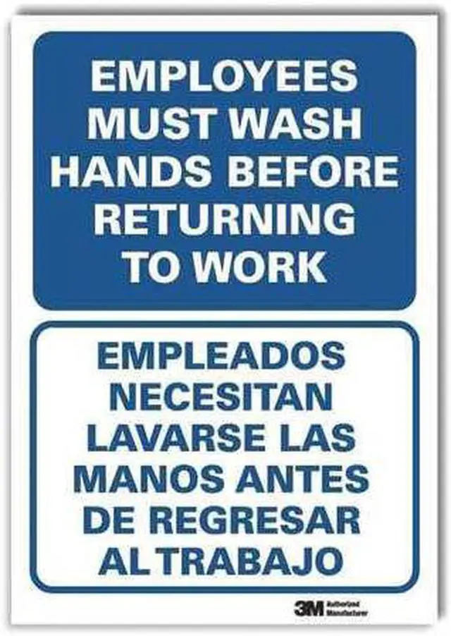 Hygiene Sign, Vertical Rectangle, Number of Printed Sides 1, English, Spanish, Sign Legend Employees Must Wash Hands Before Returning To Work/Empleados Necesitan Lavarse Las Manos Antes De Regresar Altrabajo, Sign Legend Background Color Blue, White, Sign Legend Style Text. This item has been restricted from sale in the following state (s): []