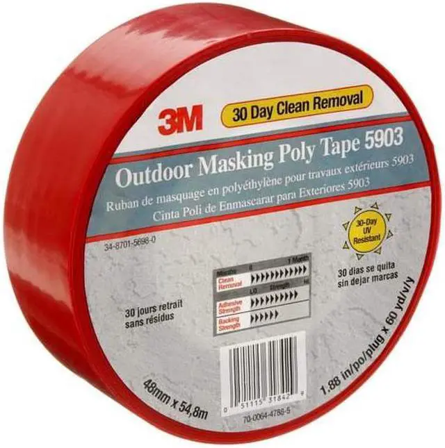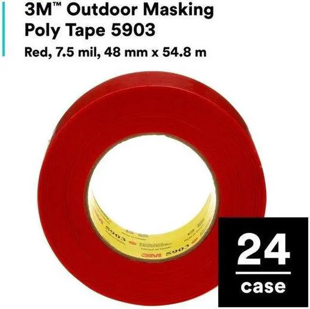 Painter's Tape, Tape Color Red, Tape Brand 3M (TM), Brand and Series 3M 5903, Imperial Tape Length 60 yd, Imperial Tape Width 1.9 in, Imperial Tape WxL 1 7/8 in x 60 yd, Tape Thickness 7.5 mil, Tape Backing Material Polyethylene Film, Tape Adhesive Material Rubber, Maximum Tape Performance Temperature 170 Degrees F, Temperature Range Up to 170 Degrees F, Series 5903, Tape Type Painter's Tape, Tape Sub-Type Rough Surface Painter's Tape, Environment Outdoor, Adhesion to Steel 79 oz/in. This item has been restricted from sale in the following state (s): []