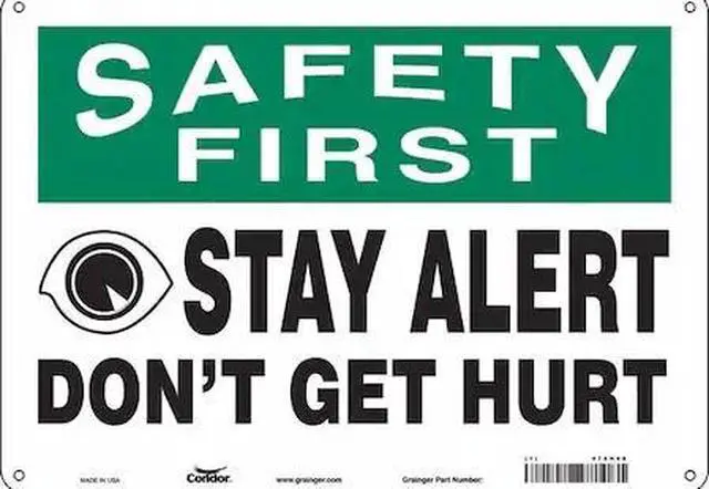 California Proposition 65: This product contains a chemical known to the State of California to cause birth defects or other reproductive harm. Safety Sign, Horizontal Rectangle, Number of Printed Sides 1, English, Sign Format Traditional OSHA, Sign Legend Stay Alert Don'T Get Hurt, Sign Legend Background Color White, Sign Legend Style Symbol and Text