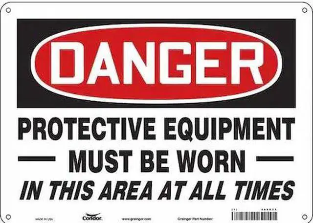 California Proposition 65: This product contains a chemical known to the State of California to cause birth defects or other reproductive harm. Safety Sign, Horizontal Rectangle, Number of Printed Sides 1, English, Sign Format Traditional OSHA, Sign Legend Protective Equipment Must Be Worn In This Area At All Times, Sign Legend Background Color White, Sign Legend Style Text