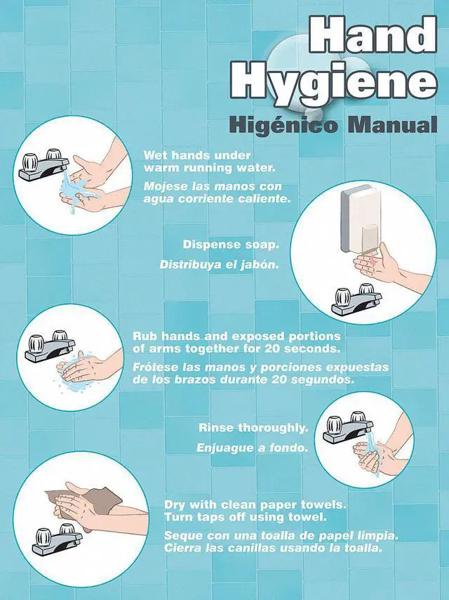 Poster, Shape Vertical Rectangle, Safety Banner Legend Hand Hygiene (Bilingual Spanish), Sign Legend Style Symbol and Text, Printed Language English, Background Color Blue, Number of Printed Sides 1, Width 17 in, Height 22 in, Thickness 0.024 in. This item has been restricted from sale in the following state (s): []