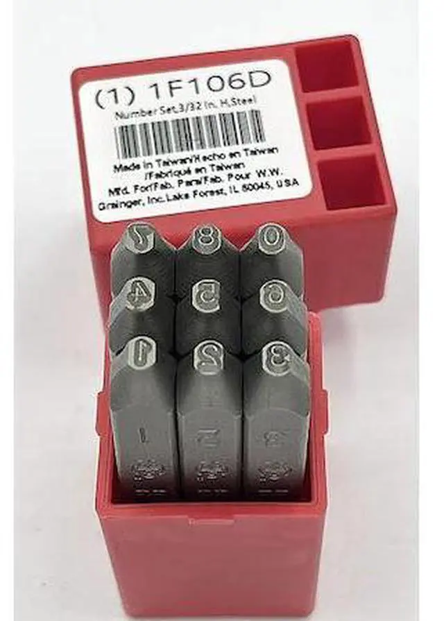California Proposition 65: This product contains a chemical known to the State of California to cause birth defects or other reproductive harm. Hand Stamp Kit, Character Height 3/32 in, Character Type Set Number Set, Characters Included 0 to 8 (With 6 Serving as 9), Duty Heavy, For Maximum Surface Hardness 62 HRC, For Shank Diameter 5/16 in, Holder Length Not Applicable, Holder Shank Size Not Applicable, Holder Width Not Applicable, Impression Character Style Gothic, Includes Holder No, Letter Casing Uppercase, Maximum Characters per Line Not Applicable, Product Type Hand Stamp Kit, Replacement Holder Mfr. Model Number Not Applicable. This item has been restricted from sale in the following state (s): []