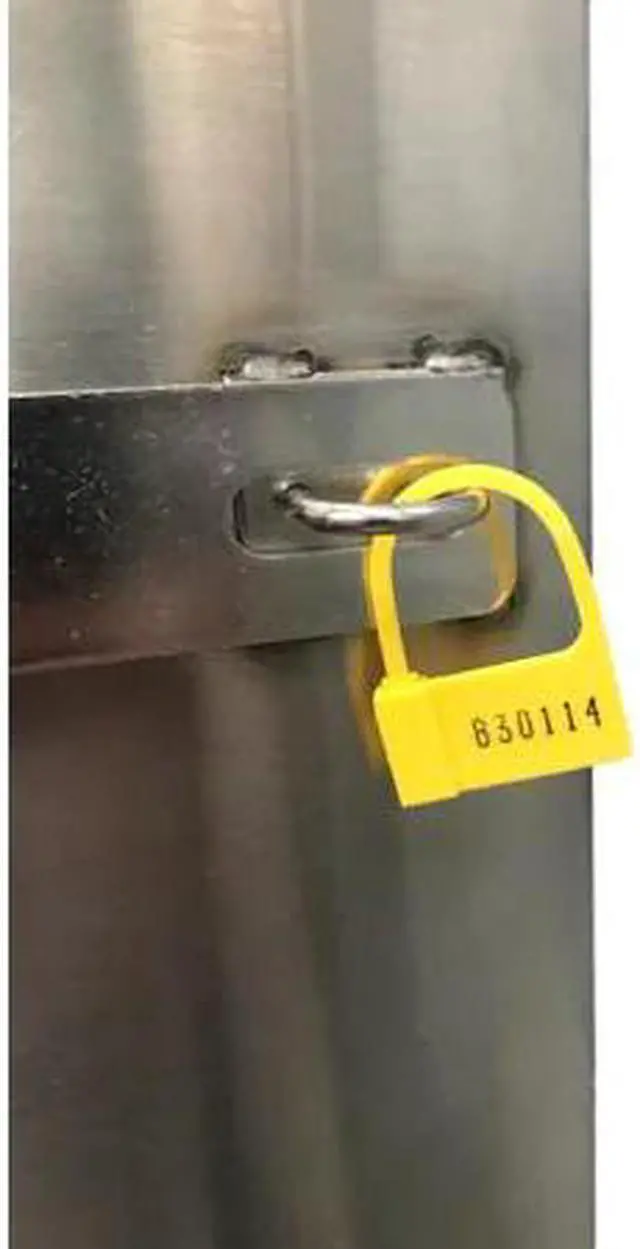 Omnimed safety control seals with numbers have a brightly colored plastic body with a flexible locking piece which threads into the body. These seals are designed for a narrow slot opening. Each is imprinted with a unique tracking number and can be broken without tools. Seals can be used on cabinets where contents need to be controlled. They provide a clear visual signal and also serve as a deterrent to prevent unauthorized cabinet access. Seals are sold in 100 count packages and come in Red, Green or Yellow.