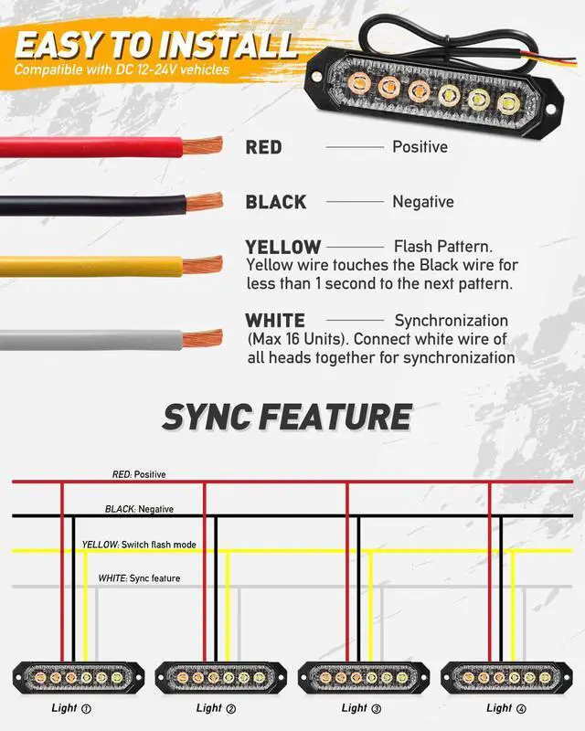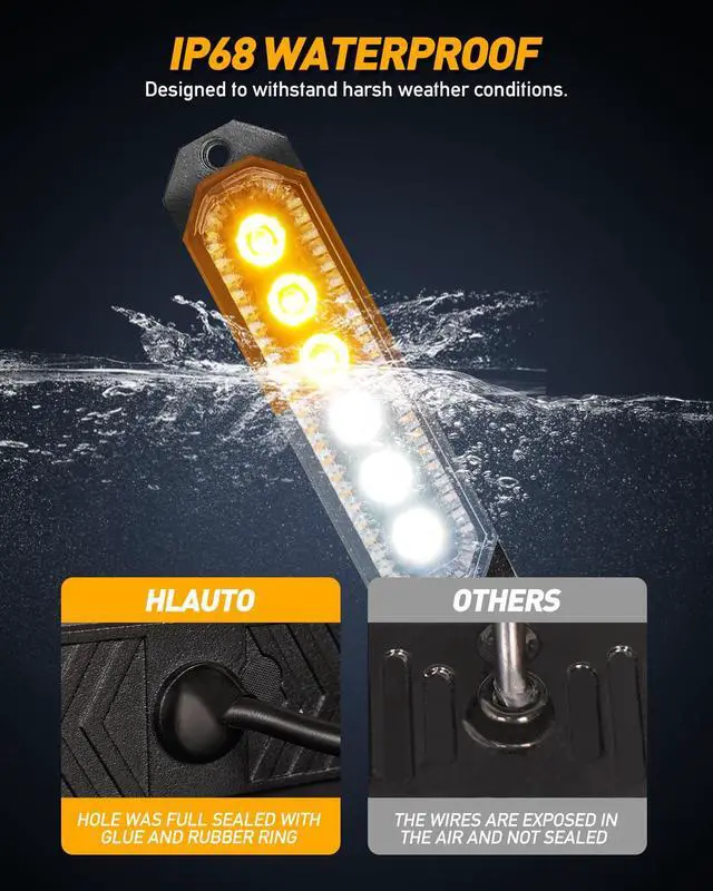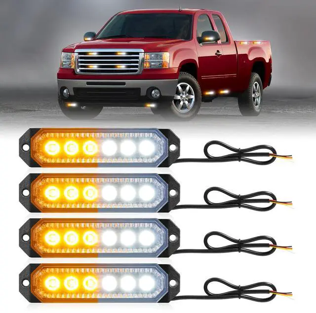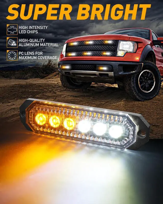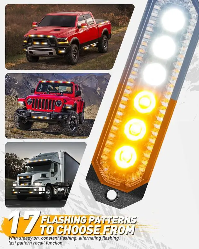 HLauto 406T 4pcs 6LED Grille / Surface Mount Emergency Strobe Lights is upgraded with Long Lasting Aluminum Alloy Housing, IP68 Waterproof Rate, and 17 Different Flashing Patterns, elevating your vehicle's safety on the road. Great for fog, rainy, snowy, sandstorm, and mud wind season emergencies.