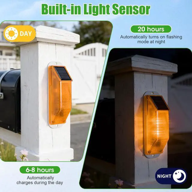Solar Powered with Smart Light Sensor: Built-in light sensor automatically charges the light during the day (68 hours of sunlight) and turns on flashing mode at night, delivering up to 20 hours of continuous operation.