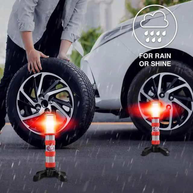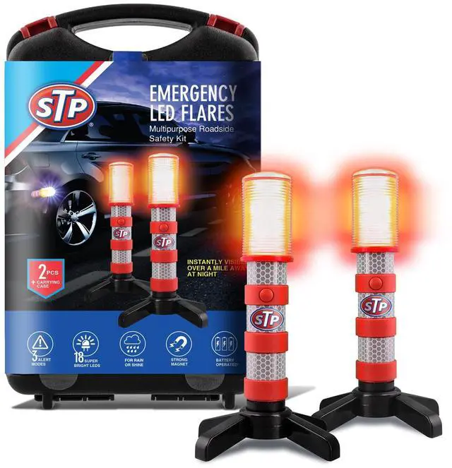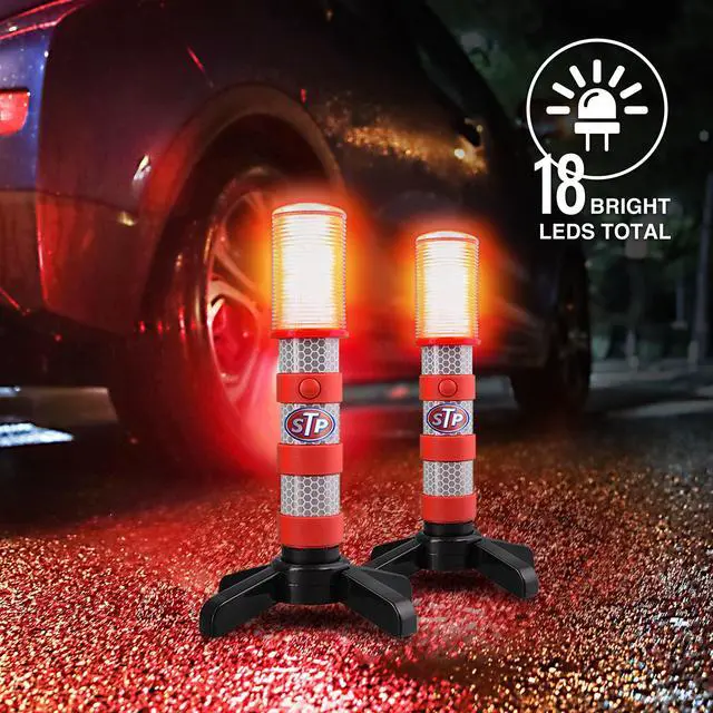 STP LED Road Flares, 3 Alert Lighting Modes: Flashing Red, Solid Red & White Flashlight, Emergency Flares for Vehicles, Visible From Up To A Mile, Foldable Stand/Built-In Magnet Sticks To Car