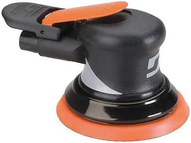 Air Random Orbital Sander, Pad Size - Air Sanders 5 in, Vinyl or Hook Pad Face Type, Orbit Dia. 3/8 in, Vacuum/Non-Vacuum Non-Vacuum, HP - Air Tools 0.28 hp, Free Speed 12, 000 RPM, Variable Speed No, Body Style - Air Tools Palm, Lever Throttle, Industrial Duty, Spindle Size 5/16 In. -24, 4.5 Average CFM @ 15 Second Run Time, 18.0 CFM @ Full Load, Required Pressure 90 psi, Air Inlet 1/4 in NPT, Min. Hose Size 1/4 in, Overall Length 6 1/2 in, Rear Exhaust Type.