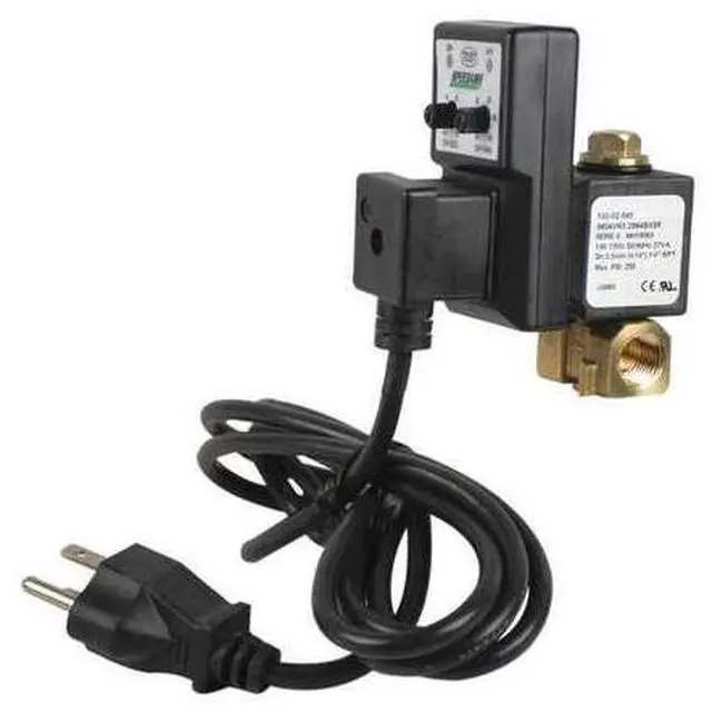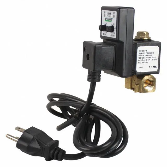 Timed Electric Auto Drain Valve, Pipe Size 1/2 in NPT, Drain Size 1/2 in, Drain Rate 4.53 gpm, Adjustable Drain Cycle 0.5 min to 45 min, Purge Time 0.5 sec to 10 sec, Voltage 100-120V, Max. Pressure 250 psi, Operating Temp. Range 14 Degrees to 140 Degrees F, Hz 50/60, Amps AC 0.3 A, Enclosure IP65, Body Material Brass, Overall Height 4 in, Overall Width 1 13/16 in, Overall Depth 3 13/64 in, Includes 6 ft Power Cord. This item has been restricted from sale in the following state (s): []
