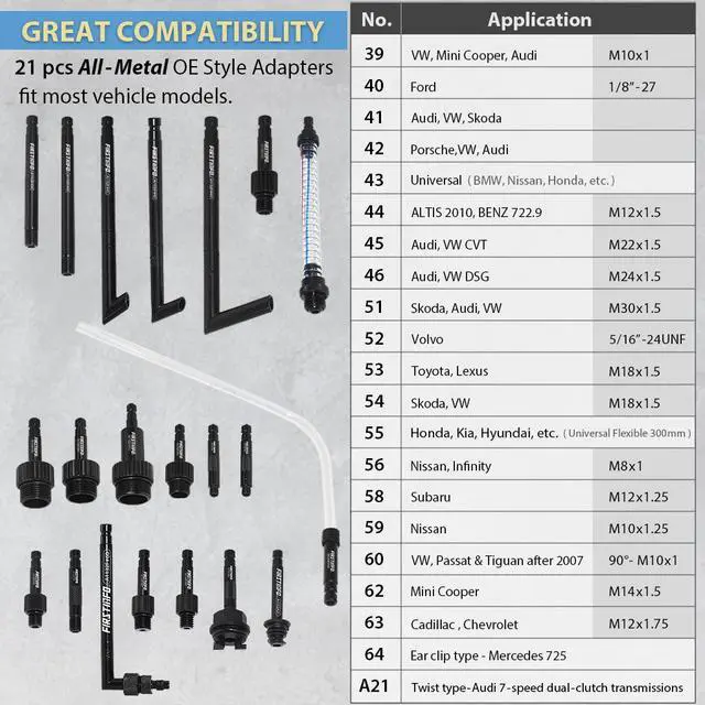 UNIVERSAL COMPATIBILITY The ATF filler set comes with Taiwan Patented ATF adapters-21 pieces; extra oil funnel and for BENZ 725.0 9-Speed accessories are available in our store for various vehicles fluid extraction and transfer. EXTRA Universal Tube to refill the new transmission fluid for those models with ATF dipstick.