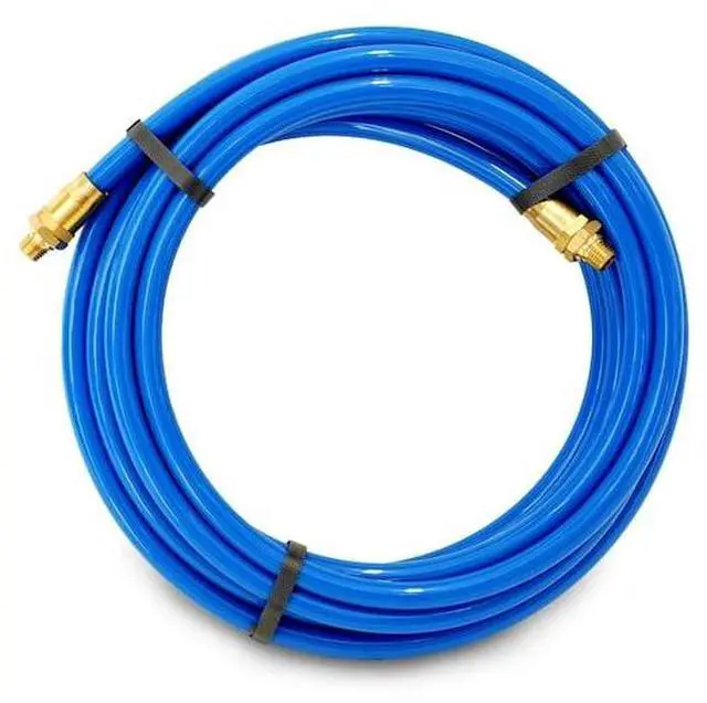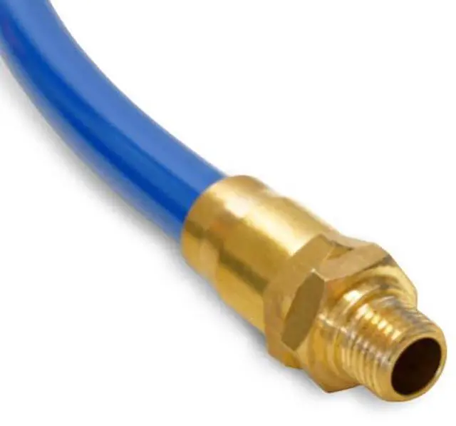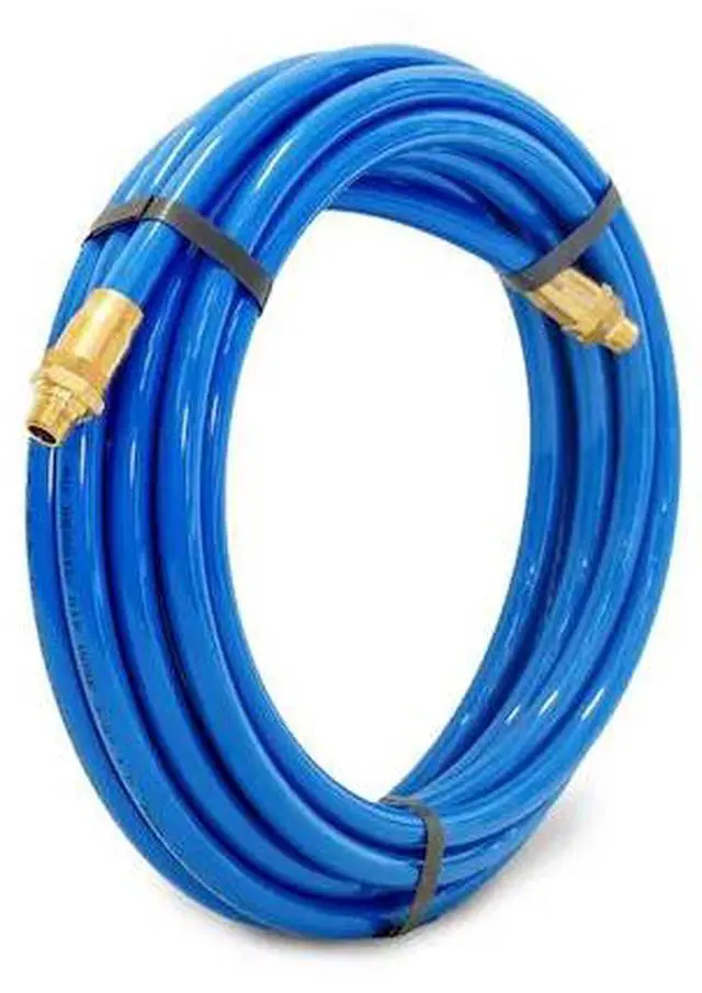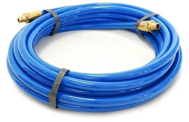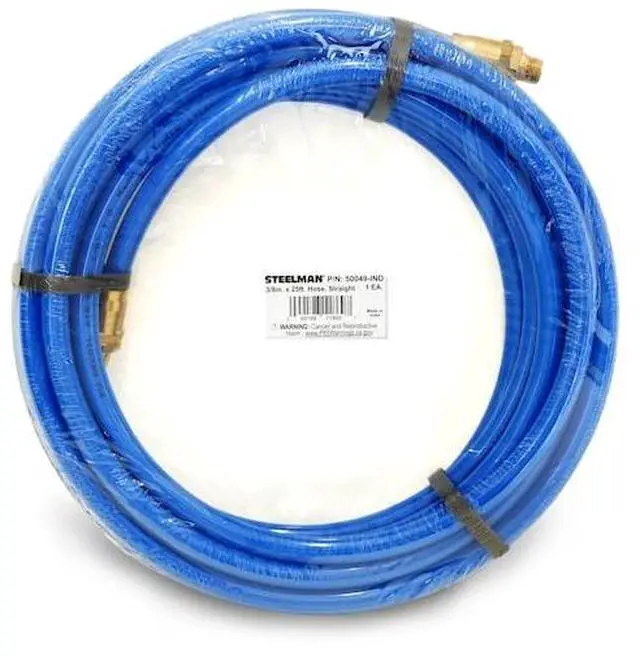 California Proposition 65: This product contains a chemical known to the State of California to cause birth defects or other reproductive harm. Get power to your pneumatic tools anywhere in your garage or workshop with the STEELMAN 50049-IND 25-Foot 3/8-Inch ID Air Hose with Reuseable 1/4-Inch NPT Brass Fittings. This straight, uncoiled hose is made from premium abrasion resistant polyurethane that easily outmatches rubber and nylon for wear resistance which comes in handy when working around unfinished or bare concrete floors. Highly kink resistant, the tubing also withstands twisting or crushing making it ideal for use in a range of situations from automotive shops to industrial work. The hose is 25% lighter than equivalent rubber hoses making it easier to handle with less effort and can withstand working compressed air pressures of up to 100 PSI. The reuseable brass fittings come pre-attached to the hose and easily connect to 1/4-inch NPT quick connects, adapters, and compressors.