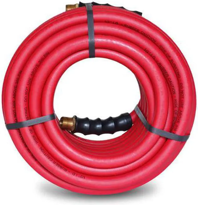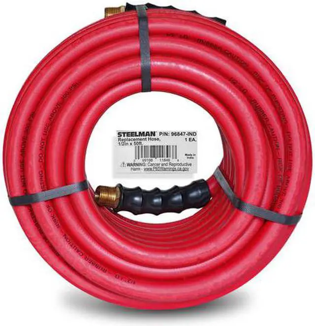 California Proposition 65: This product contains a chemical known to the State of California to cause birth defects or other reproductive harm. Bring maximum power to your pneumatic tools with the STEELMAN 96847-IND 50-Foot Long Rubber 1/2-Inch ID Hose Reel Replacement Air Hose with 1/2-Inch NPT Brass Fittings. Designed for use as an individual hose or as a replacement for damaged hoses used in STEELMAN 96840 and 96840-IND air hose reels, this hose is ideal for a range of professional work and personal project applications. Made of premium, fiber-reinforced rubber, this hose resists kinking and has excellent abrasion resistance making it perfect for use in workshops and garages with concrete floors. Rated for a working pressure of up to 300 PSI, this hose can easily handle normal shop compressed air pressures without fear of unexpected ruptures. The pre-attached brass fittings have 3/8-inch NPT male threads for easy attachment to additional hoses, adapters, and connectors and for added protection on these stress points, each end of the hose features a bend protector.
