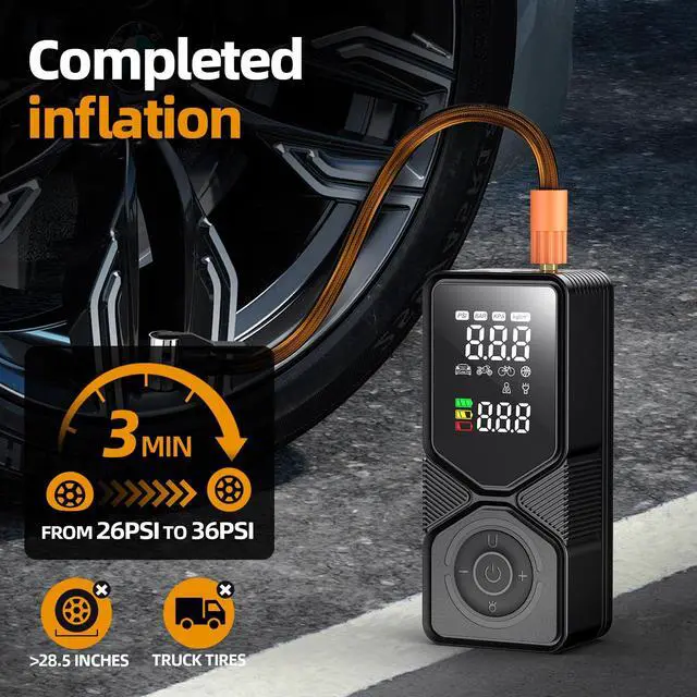 Lightning-Fast Inflation: High-efficiency metal motor delivers rapid airfloweasily add 10 PSI to a car tire in under 60 seconds (full tire takes 3-6 mins).