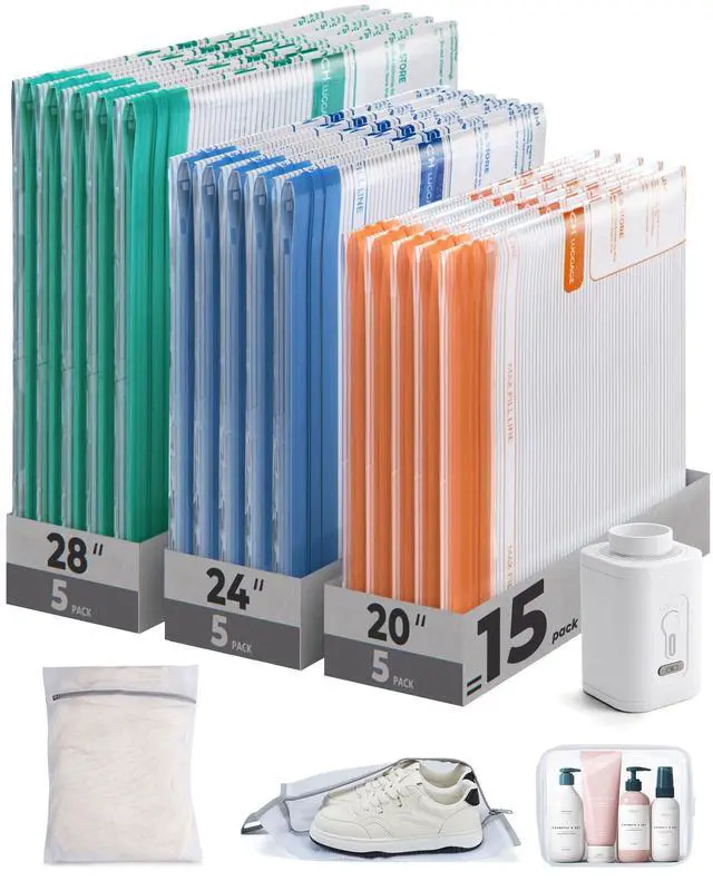 18-Piece Perfect Travel Kit: Includes 15 vacuum bags in 3 sizes (15.7×19.7in, 15.7×23.6in,19.7×23.6in), each size featuring a distinct color for quick identification. The added shoe bag, laundry(dirty) bag, and toiletry bag help you maintain an organized packing system throughout your journey.