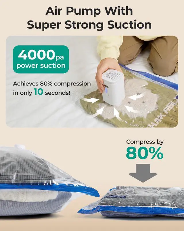 4000Pa High-Speed Powerful Compression: Instantly achieves up to 70% space savings, compressing travel vacuum storage bags within 15 seconds. Effortlessly complete the full set in under 3 minutes for efficient organization.