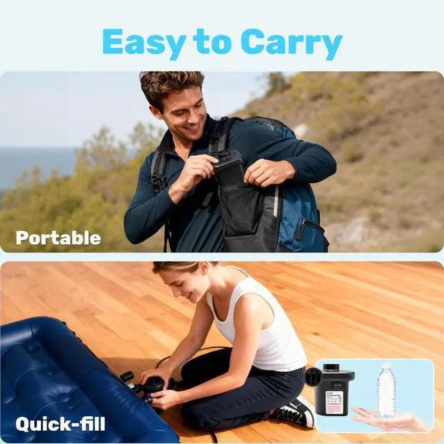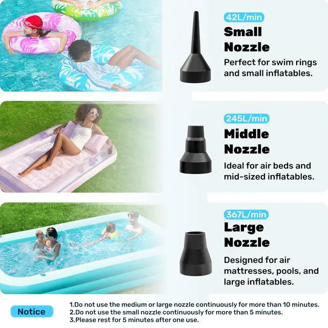 Safe, Durable, Built-in Protection, Reliable.Safety is key. This electric pump for inflatables has overheat auto shut-off. Follow guidelines: don't use the small air pump nozzle for over 5 minutes continuously. Its durable build ensures this pool air pump is a reliable inflatable bed pump for long-term use. Use only the provided air pump adapter for inflatables.