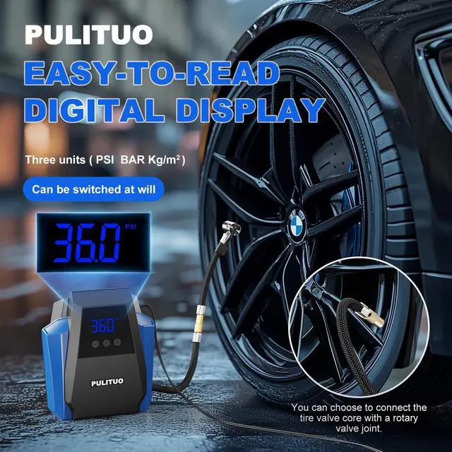 [10FT MAXIMUM REACH + 150PSI POWER] Complete Tire Access - This portable air compressor for car tires features a 10ft extended cord to reach all wheels on SUVs and pickups without repositioning. 150PSI Maximum Inflation Pressure - The PULITUO car tire inflator delivers rapid inflation for cars, SUVs, motorcycles and more. Family & Adventure Ready - Your reliable car tire air pump portable for roadside emergencies and garage maintenance. For Personal Vehicles Only - Not rated for commercial trucks.