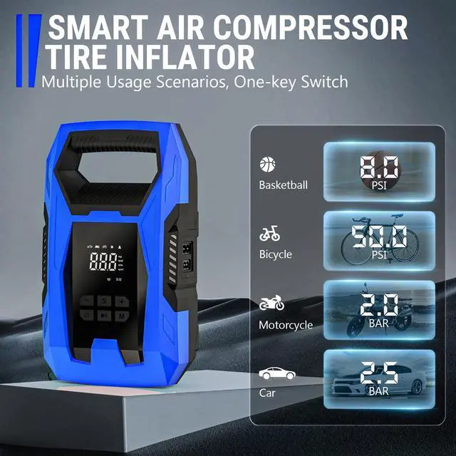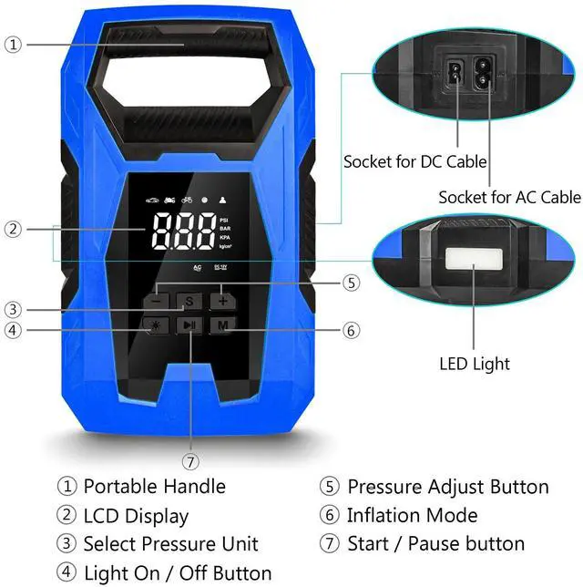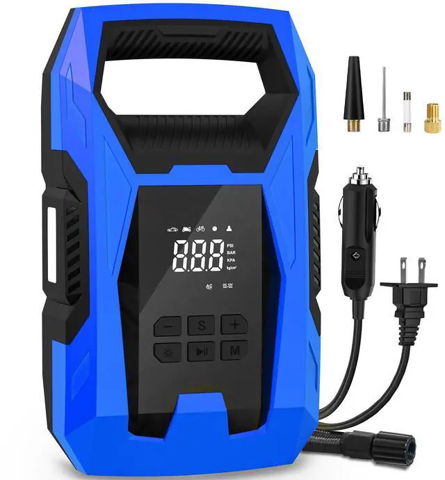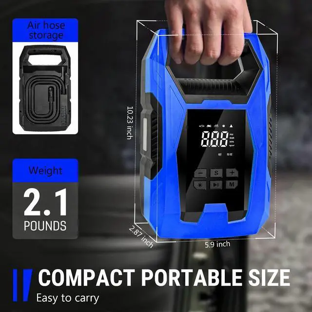 Why Choose the AC/DC 2-in-1 Tire InflatorUncompromised Safety: Getting flattires while on the road is a nightmare for drivers. The Digital Tire Inflator helps get you back on the road safely and quickly with its smart and easy-to-use tire inflation function. You dont have to wait for help to arrive when you know you can fix the tire problem yourself with the right equipment. It also helps you save on fuel by preventing driving with uneven tire wear. Its your must-have safety and efficiency partner on the road anytime,anywhere! Works with Multiple Vehicles: air pump covers different car sizes and types, from compact sedans to SUVs. Its 10ft cord is long enough to reach all four tires.Its powerful engine can pump up to 150psi enabling it to capably fill car tires in very little time. NOTICE: * The car air pump only works with 12V DC or 110V AC power source. * The car air pump is not applicable to Truck Tires. Intelligent Multi-function: The portable air compressor smartly incorporates a LED flashlight, tire pressure gauge and tire inflator in one user-friendly device to ensure and maximize your safety.
