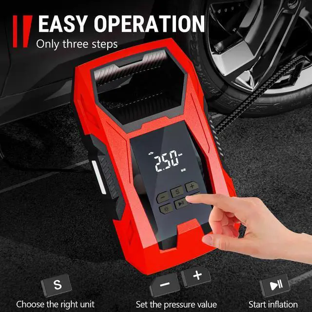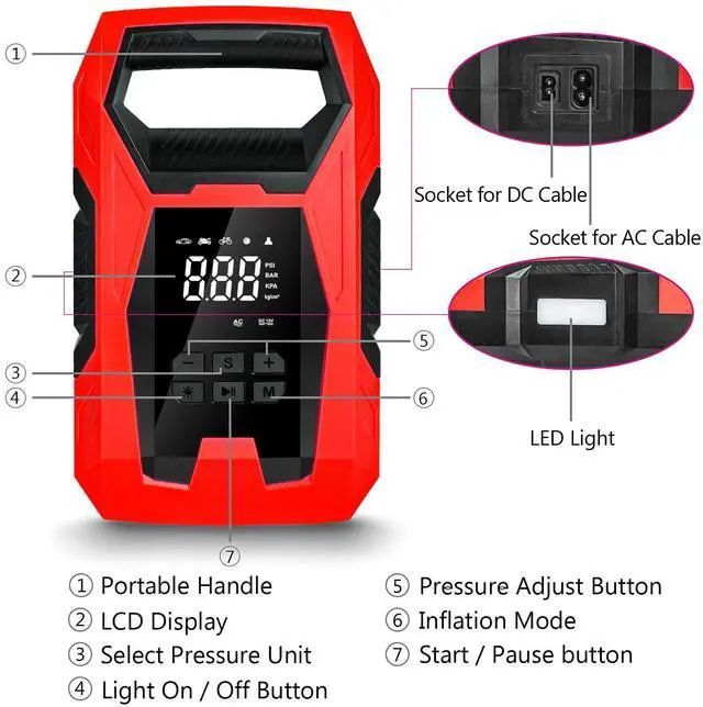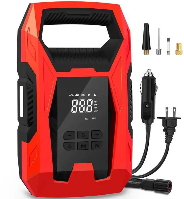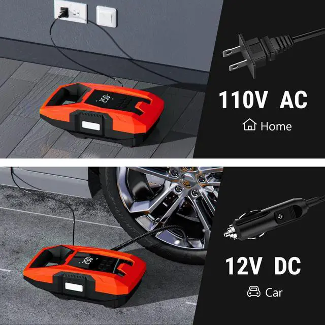 Why Choose the AC/DC 2-in-1 Tire Inflator? Uncompromised Safety: Getting flattires while on the road is a nightmare for drivers. The Digital Tire Inflator helps get you back on the road safely and quickly with its smart and easy-to-use tire inflation function. You dont have to wait for help to arrive when you know you can fix the tire problem yourself with the right equipment. It also helps you save on fuel by preventing driving with uneven tire wear. Its your must-have safety and efficiency partner on the road anytime,anywhere! Works with Multiple Vehicles: air pump covers different car sizes and types, from compact sedans to SUVs. Its 10ft cord is long enough to reach all four tires.Its powerful engine can pump up to 150psi enabling it to capably fill car tires in very little time. NOTICE: * The car air pump only works with 12V DC or 110V AC power source. * The car air pump is not applicable to Truck Tires. Intelligent Multi-function: The portable air compressor smartly incorporates a LED flashlight, tire pressure gauge and tire inflator in one user-friendly device to ensure and maximize your safety.