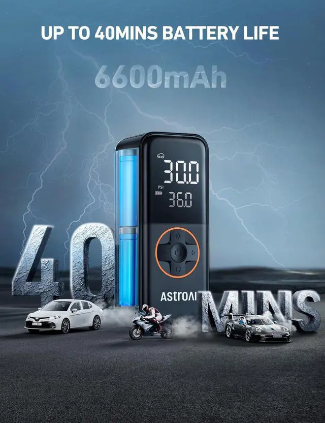 UP TO 40MINS BATTERY LIFE: The L4 air compressor has a large 6600mAh battery capacity that unleashes massive energy and extends usage time. With just one full charge, you can inflate 8 car tires (225/75/R17) over its 40-minute non-stop runtime. Say goodbye to quick battery draining, and insufficient power.