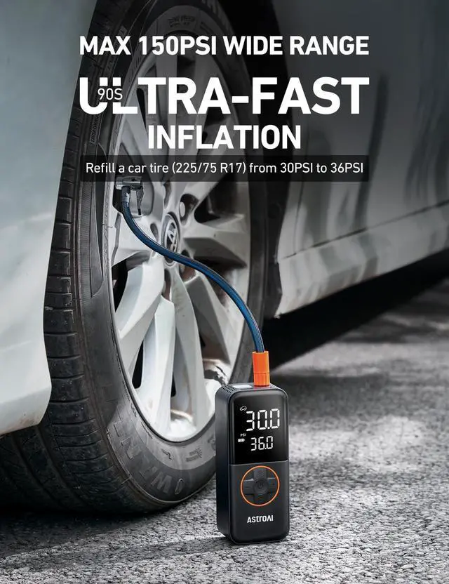 90s ULTRA-FAST INFLATION: The L4 tire inflator delivers powerful inflation up to 150PSI. It can quickly refill a car tire (225/75 R17) from 30PSI to 36PSI in just 90 seconds. This portable tire inflator is a must-have for emergency preparedness and efficient refilling.