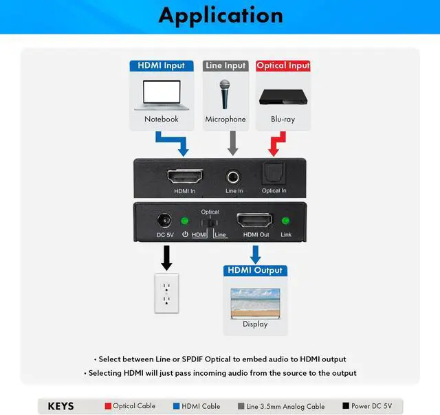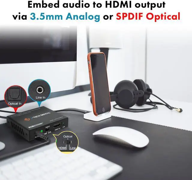 Embed audio to the HDMI output via 3.5 mm/line or SPDIF Optical