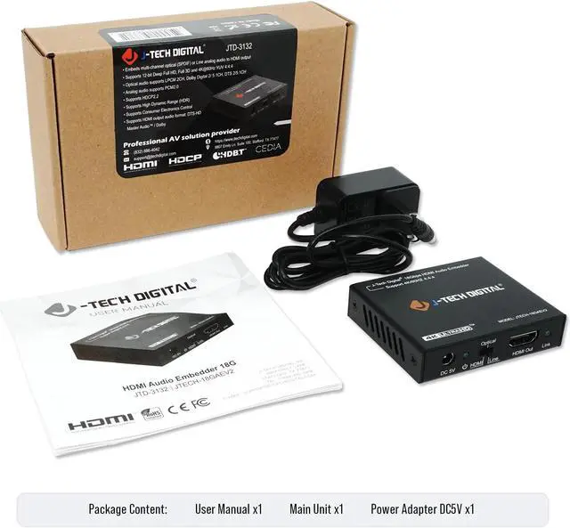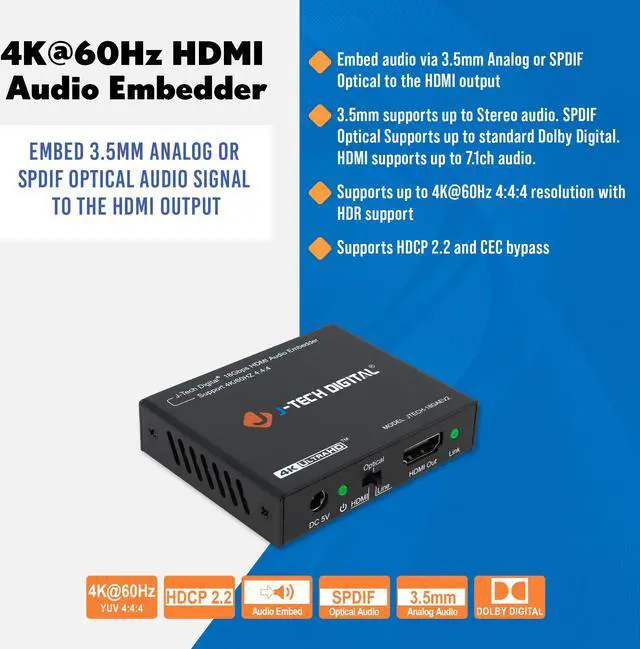 Do you need to merge separate audio and video sources into a single HDMI signal? Whether you're creating video tutorials or revisiting live stream gaming, the JTECH-18GAEV2 is your solution! This device can embed HDMI video (up to 4K@60Hz 4:4: 4) along with either multi-channel digital optical audio (TOSLINK/SPDIF) or analog audio ( 3.5 mm/line) into one HDMI output. You also have the flexibility to retain the original HDMI audio instead of replacing it. This feature allows for more options without the hassle of swapping cables; simply flip a switch. Now, instead of just sharing video content, you can ensure your audience hears your commentary as they watch.
