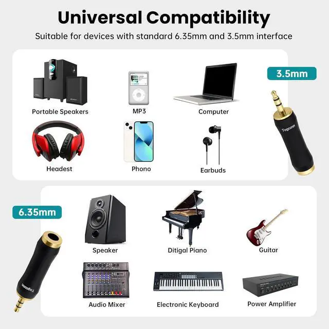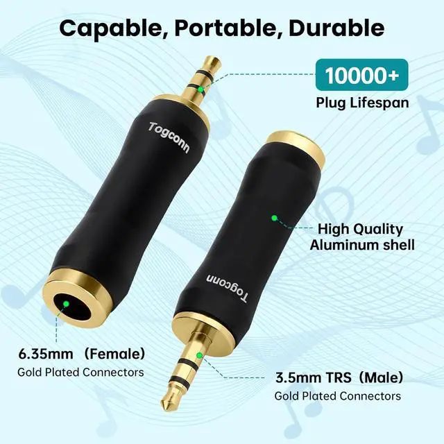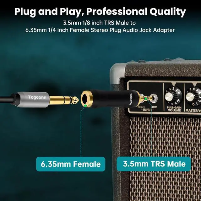 3.5 mm to 6.35 mm adapter: Togconn 3.5 mm male to 6.35 mm female adapter helps you connect all 1/8-inch ( 3.5 mm) TRS Stereo jack devices to 6.35 mm extension cables or adapters in a simple way.