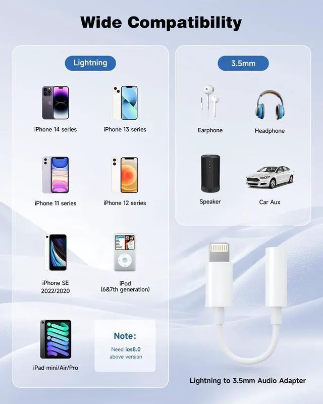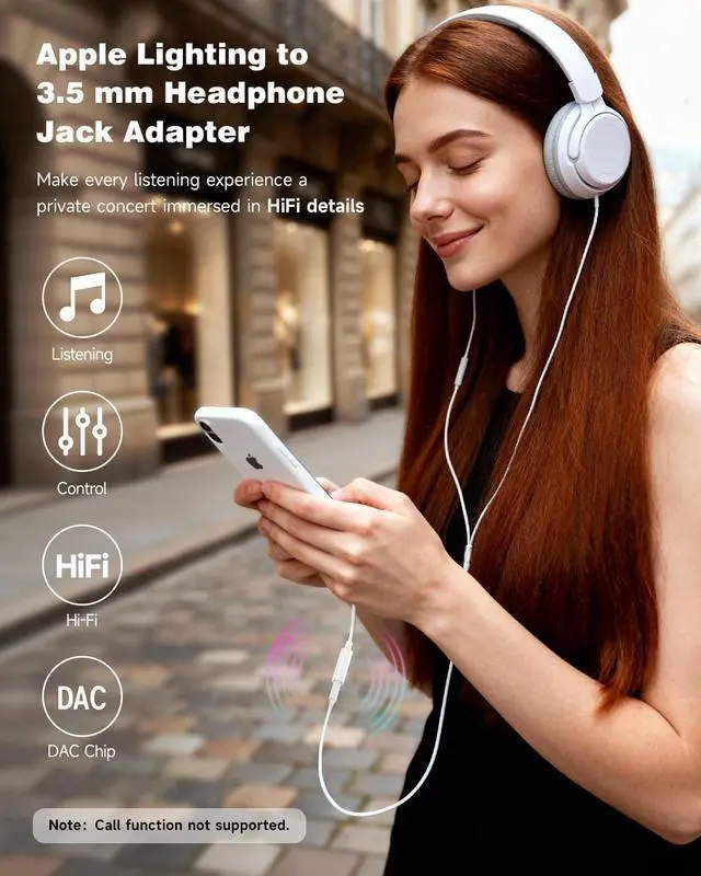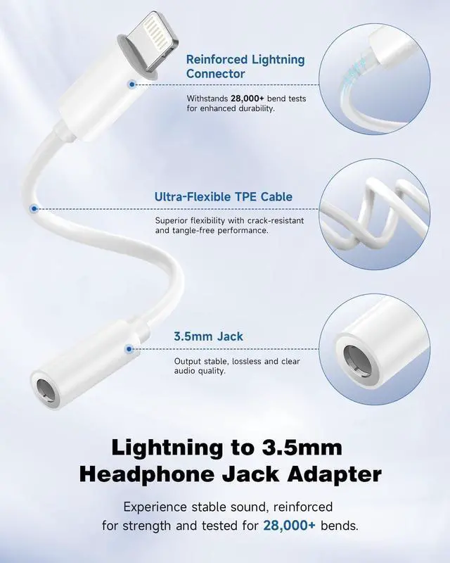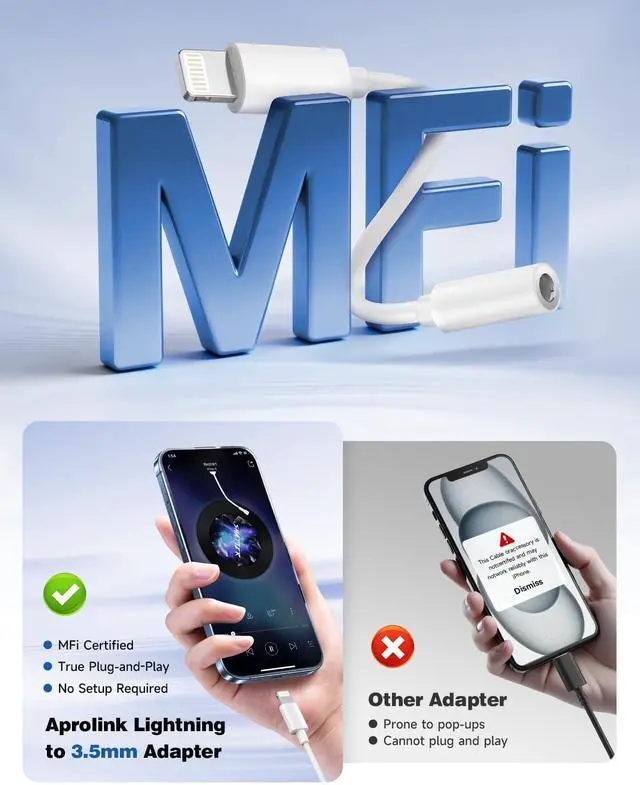 MFi Certified & Universal CompatibilityThis MFi-certified Lightning to 3.5 mm adapter ensures stable plug-and-play connectivity across all iOS systems including iPhone 14/14 Plus/14 Pro/14 Pro Max/13/13 mini/13 Pro/13 Pro Max/ 12/12 mini/12 Pro/12 Pro Max/11/11 Pro/11 Pro Max/ X/XR/XS/XS Max/ 8/8 Plus/7/7 Plus iPad models (iPad/iPad mini/iPad Air/iPad Pro) and iPod touch (6th/7th Gen). Perfect for use with your headphones earphones car stereo or any other 3.5 mm audio accessorySuperior Hi-Fi Audio with Built-in DAC ChipEngineered with a smart DAC chip this Lightning to 3.5 mm headphone jack adapter delivers crisp lossless audio up to 48kHz/24-bit. The Aprolink iPhone headphone adapter is perfect for unlocking high-fidelity sound in your music movies and games offering exceptional clarity and depth beyond standard adaptersIn-Line Control & Stable TransmissionThis headphone jack adapter allows you to play pause and adjust volume directly from your compatible headphones offering effortless convenience (note: call function not supported). This reliable performance is further enhanced by the 100% copper core which guarantees stable and clear signal transmissionDurable TPE Construction & 3-Pack ValueThis durable Lightning to headphone jack adapter is built with flexible tangle-resistant TPE material and reinforced connectors to effectively resist bending and wear. The practical 3-pack offers exceptional value allowing you to keep one headphone adapter in your car bag and office ensuring you always have a backup ready. Never be without your music due to a lost or forgotten adapter againVersatile All-Scenario UseThis Lightning to AUX adapter serves as your ultimate audio companion: stream playlists through your car stereo during commutes connect headphones for focused workouts enjoy movies on-the-go while traveling or hook it up to home speakers. This compact iPhone dongle is your key to accessing high-quality immersive audio anywhere