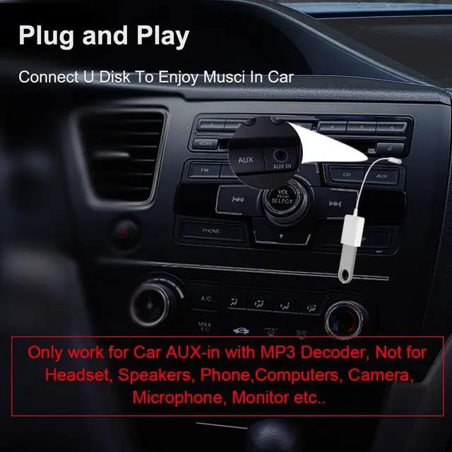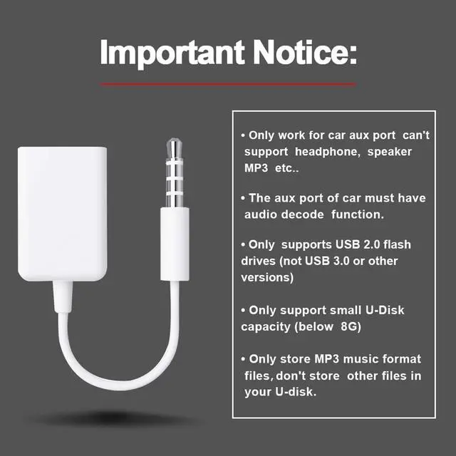 Do not store videos folders or other file types. IMPORTANT NOT ALL CARS ARE COMPATIBLE-- Your car must support MP3 file decoding through the AUX port. If your AUX port is passive (only for audio input) this adapter will not work. Some factory radios may not support this functionplease check before purchasing. WHAT YOU GET-- Includes 1× AUX to USB Adapter Cables. Comes with a 24-month replacement warranty and lifetime support. If the adapter doesn't work with your vehicle contact us in the first time.