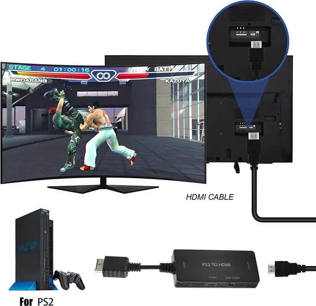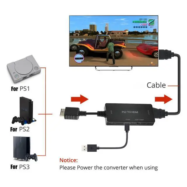 Supports HDMI 16:9/4:3 aspect ratio output switch, and is only compatible with PS1/PS2/PS3 game consoles (PS1 games can be played on a PS2 console with this converter). It connects your PS2 to HDTV/HDMI monitors with synchronized audio and video output, and supports all PS2 display modes including 480i, 576i, 480p, bringing more fun to your PS2 gaming experience.