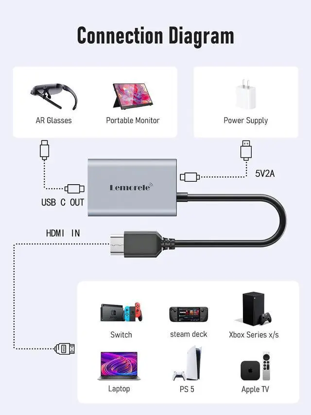 Lemorele HDMI to USB Type C Adapter 4K@60HZ w/Cable Design, Plug and Play, for RayNeo, XREAL Air, Rokid Air, Thunderbird AR, GRAWOOA, Sonny, Switch, Steam Deck, Xbox, PS5, PS4, Google TV
