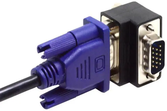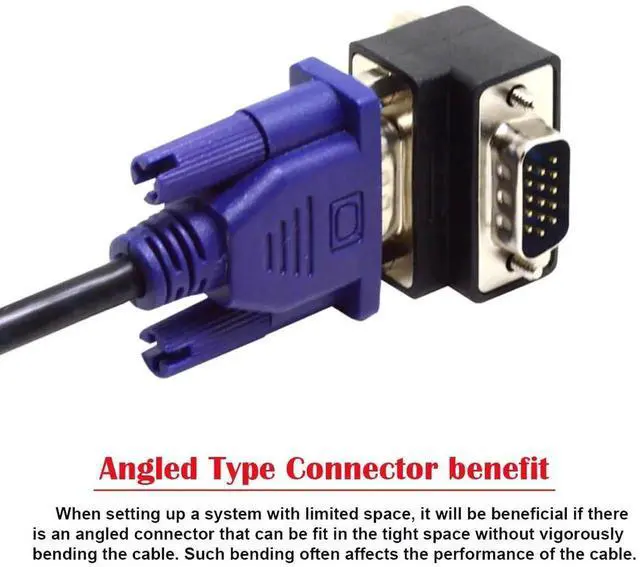 This Angled VGA to VGA Cable Adapter Type provides one angled VGA male connector and one standard VGA female connector.