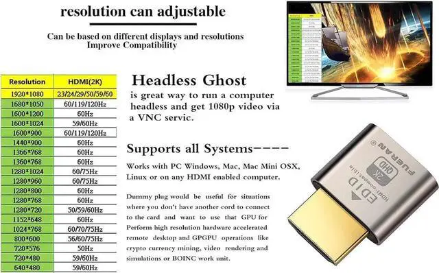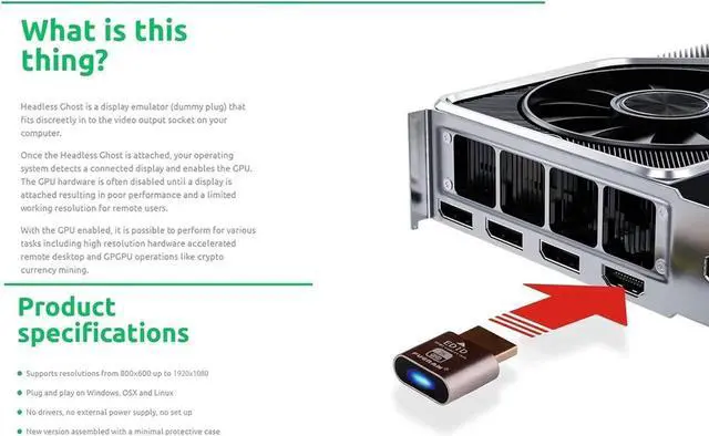Will work with any graphics card that has HDMI output. No incompatibility problems if regular LCD monitor works with particular output then these dummy plugs will also work with 100% confidence as they act exactly the same as real LCD monitor. Works with Windows OSX Linux and just about everything else Ultra-compact low profile designNo drivers no configuration no power cable - just set and forget Allows for high resolution GPU accelerated remote desktopActs as a dummy plug for use with GPU tasks such as crypto currency miningWorks great with Virtual Desktop on Oculus Rift & HTC Vive.
