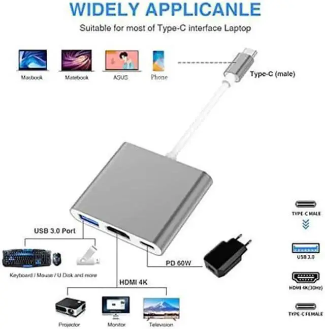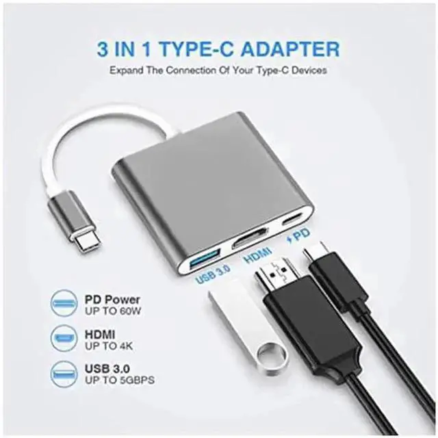 HDMI Adapter: USB Type-C to HDMI / USB-C/ USB 3.0 Multiport Adapter with small size & lightweight, easy to carry around in pocket.