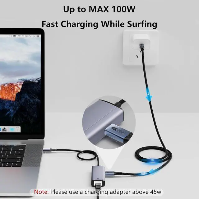 GIGABIT ETHERNET: USB-C to Ethernet + Charge Adapter offering up to 1000Mbps speeds additionally backward compatible with 100Mbps/10Mbps networks (requires Cat6 and above Ethernet cables for 1Gbps). Perfect for devices without Ethernet ports or access to wired networks it ensures stable connections for work online activities meetings classes gaming and HD video streaming.