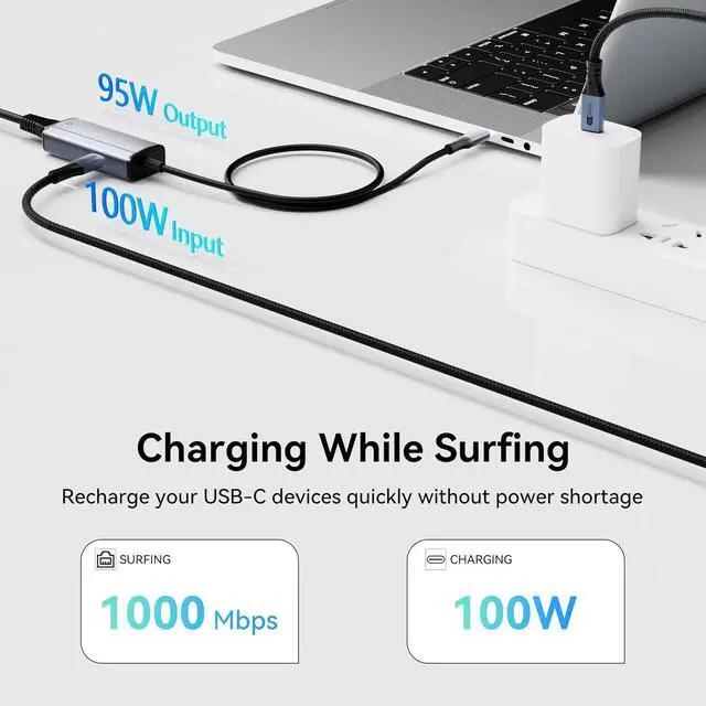 POWER CHARGE: This 2-in-1 usb c to ethernet adapter allows you connect to the internet instantly from virtually any USB-C 3.0 device and enjoy stable connection speeds of up to 1 Gbps while charging device simultaneously.