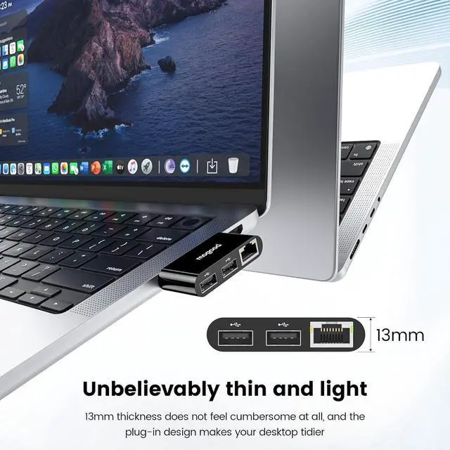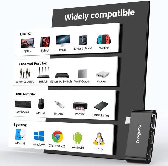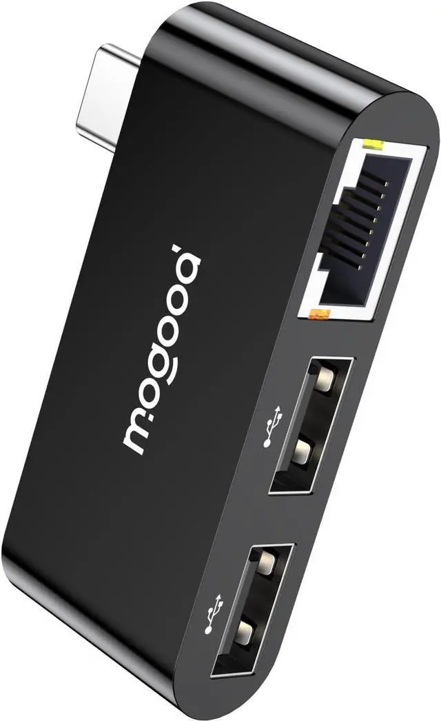 Gigabit Ethernet adapterMOGOOD Type C to RJ45 adapter with a peak network speed of up to 1000Mbps and backward compatibility with 100Mbps/10Mbps networks. It will fully utilize your network performance whether it's transferring massive files participating in intense gaming competitions or attending important company meetings that cannot be missed you can enjoy a stable and high-speed network experience (note: to achieve gigabit network please make sure to use CAT6 or above Ethernet cable connection). USB ExpansionUSB C Ethernet hub expands the Type C port to two USB 2.0 ports with a data transfer speed of up to 480Mbps. It can transfer files in seconds and can simultaneously connect to external hard drives USB flash drives mice keyboards USB headphones speakers USB network cameras and other devices solving the problem of insufficient ports. Stable and reliableConnect the network cable to the Ethernet adapter and enjoy high-speed Internet without any driver. Wired networks provide a more stable and secure network environment than wireless networks enabling smooth and latency free data transmission movie playback and video conferencing with zero latency issues. Whether it's office work home entertainment or campus learning it's a reliable choice for network connectivityWide compatibilityUSB C Internet adapter with MacBook Pro/Air iPad Mini/Air/Pro Surface Pro/Go Compatible with other USB C laptops/tablets/Smartphone; Compatible with operating systems such as Chrome OS Windows MAC etcDurable and environmentally friendly3 in 1 Type C LAN hub adopts a lightweight wireless design and the environmentally friendly plastic shell is simple and durable improving heat dissipation. It is lightweight and compact making it easy for you to carry around It is a good companion for you to travel anytime