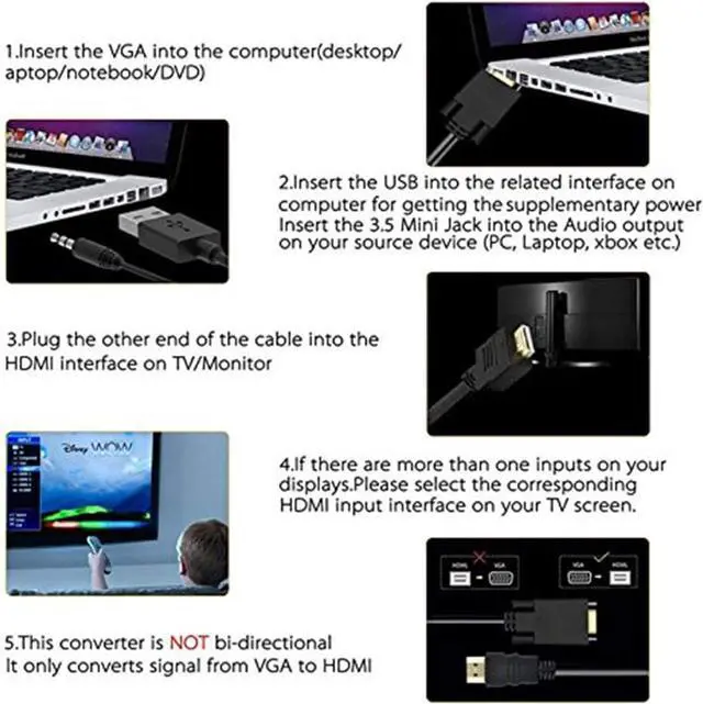 HD performance: Imported super quality adapting chipset converting and outputting VGA signal to HDMI display devices. This converter is NOT bi-directional it is vga to hdmi adapter ONLY convert VGA signal into HDMI signal and USB power supply is necessary.