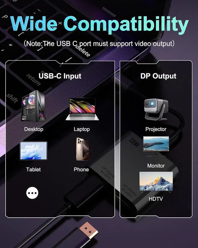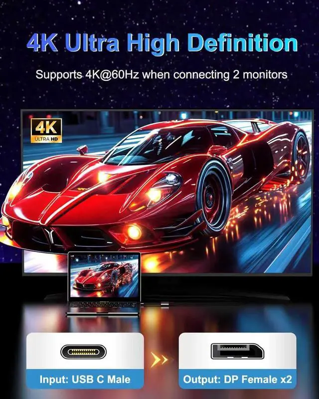 2-IN-1 USB C to Dual DisplayPort AdapterThis display port splitter for dual monitors can expands your laptops USB-C port into 2 display ports and this USB-C to Dual DP Ports Adapter allows you to do different project on different monitors. Boost your work productivity and efficiencyDual 4K@60Hz UHD DisplayThis USB C to DisplayPort adapter supports resolutions up to 4K@60Hz for a single monitor or dual monitors via DisplayPort MST technology (3840x2160@60Hz each). Also supports 1440p and 1080p @60Hz.